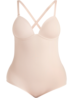 Tailored and sleek this firm control body shaper has a low centre front and plunging back, with detachable back straps that can be cross over. Contour cups provide good support with a smooth profile, and the gusset lining is 100% cotton with a functional popper opening. Invisible zoned support panels, sculpts your body creating perfectly smooth curves.